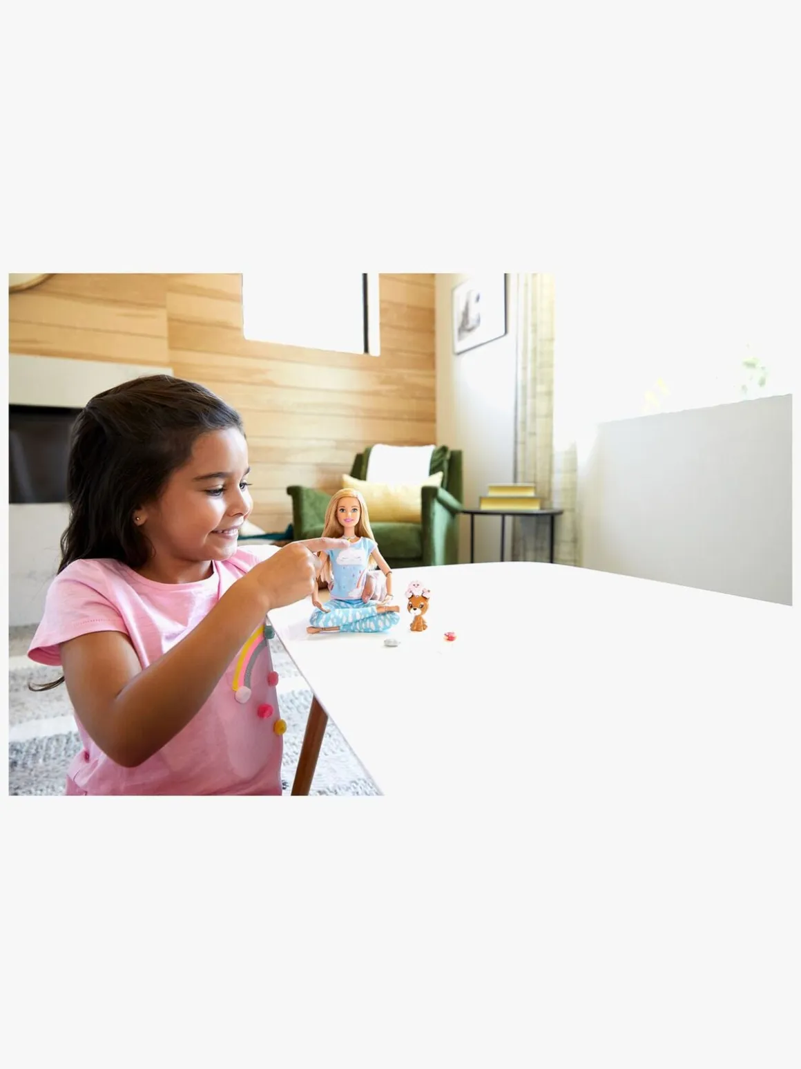 Hav det skønt sammen med Barbie og hendes hundehvalp! I dette sæt får du blandt andet en Barbiedukke iklædt afslappet tøj, en hundehvalp, og ”tankebobler” til hundehvalpen. Tryk på dukkens halskæde for at starte en af dem fem guidede meditationsøvelser med lyd- og lyseffekter. Sæt tankeboblerne fast på hunden for at hjælpe den med at koncentrere sig.