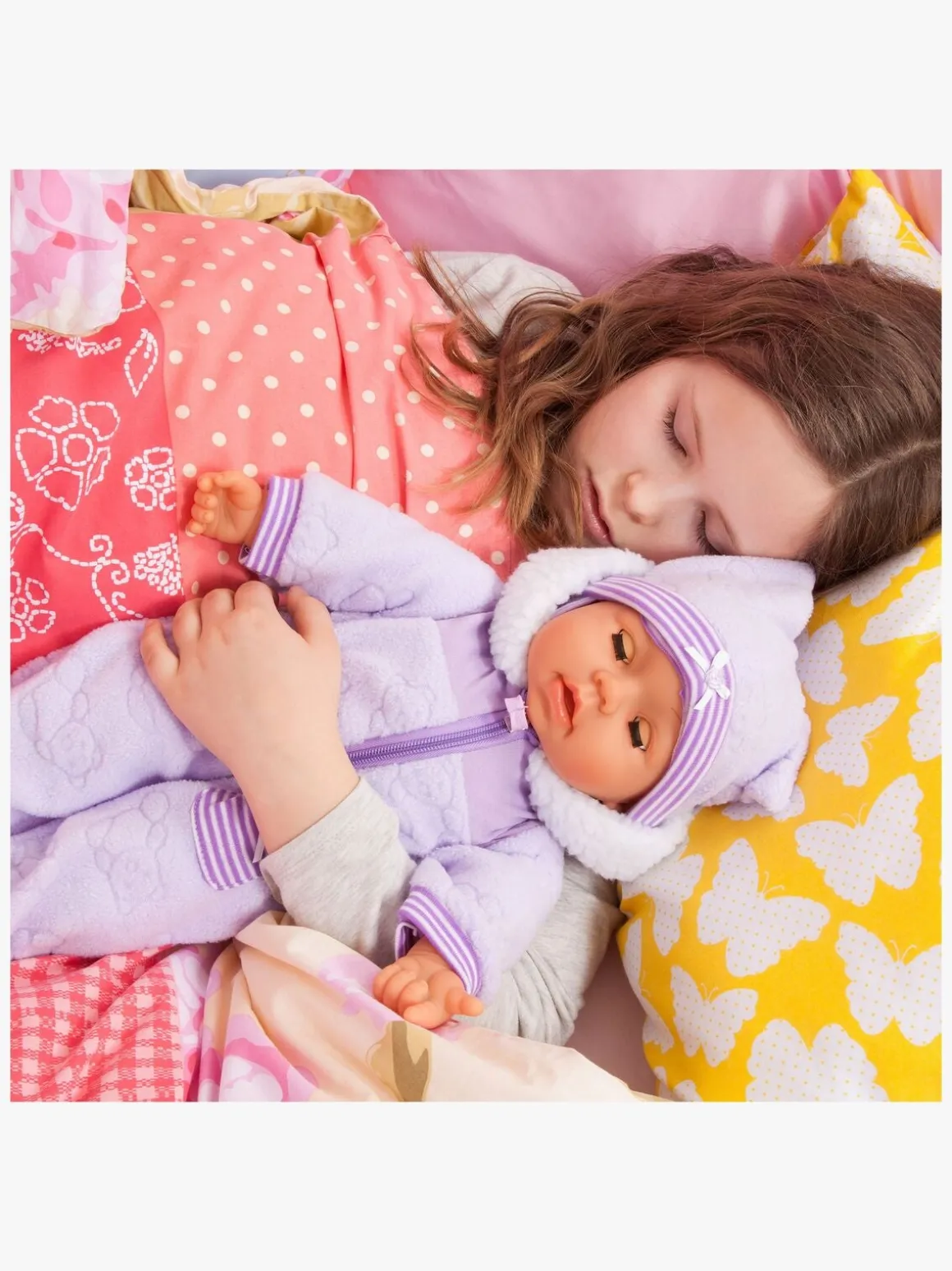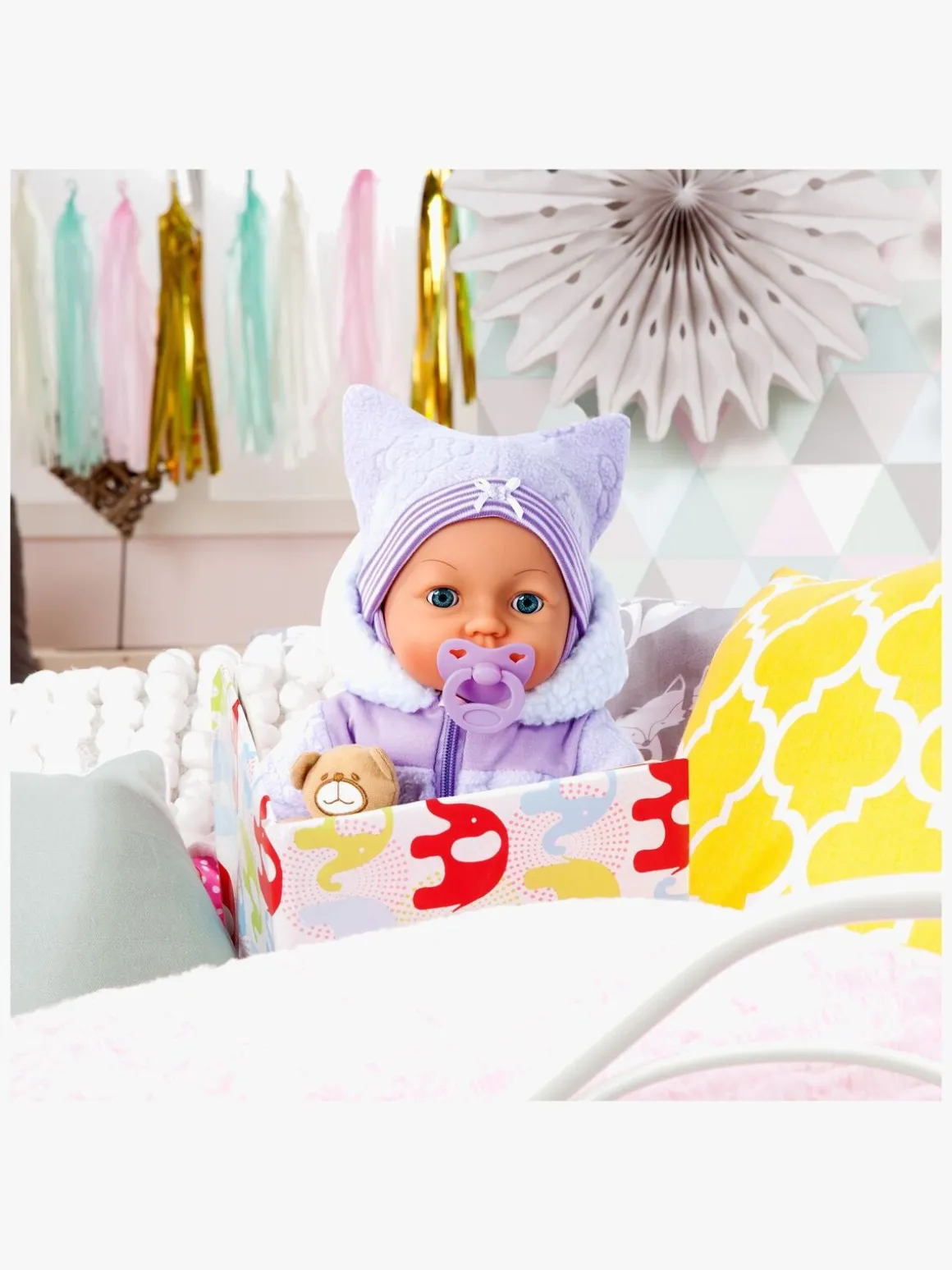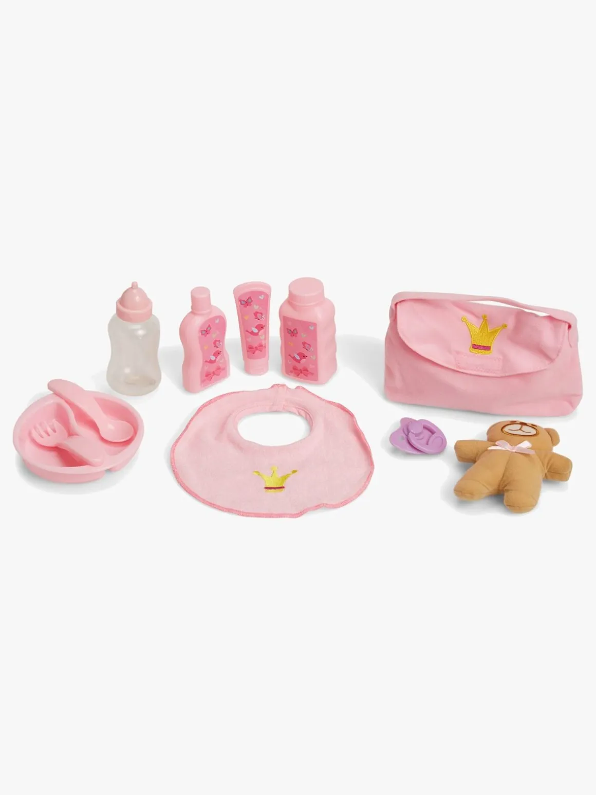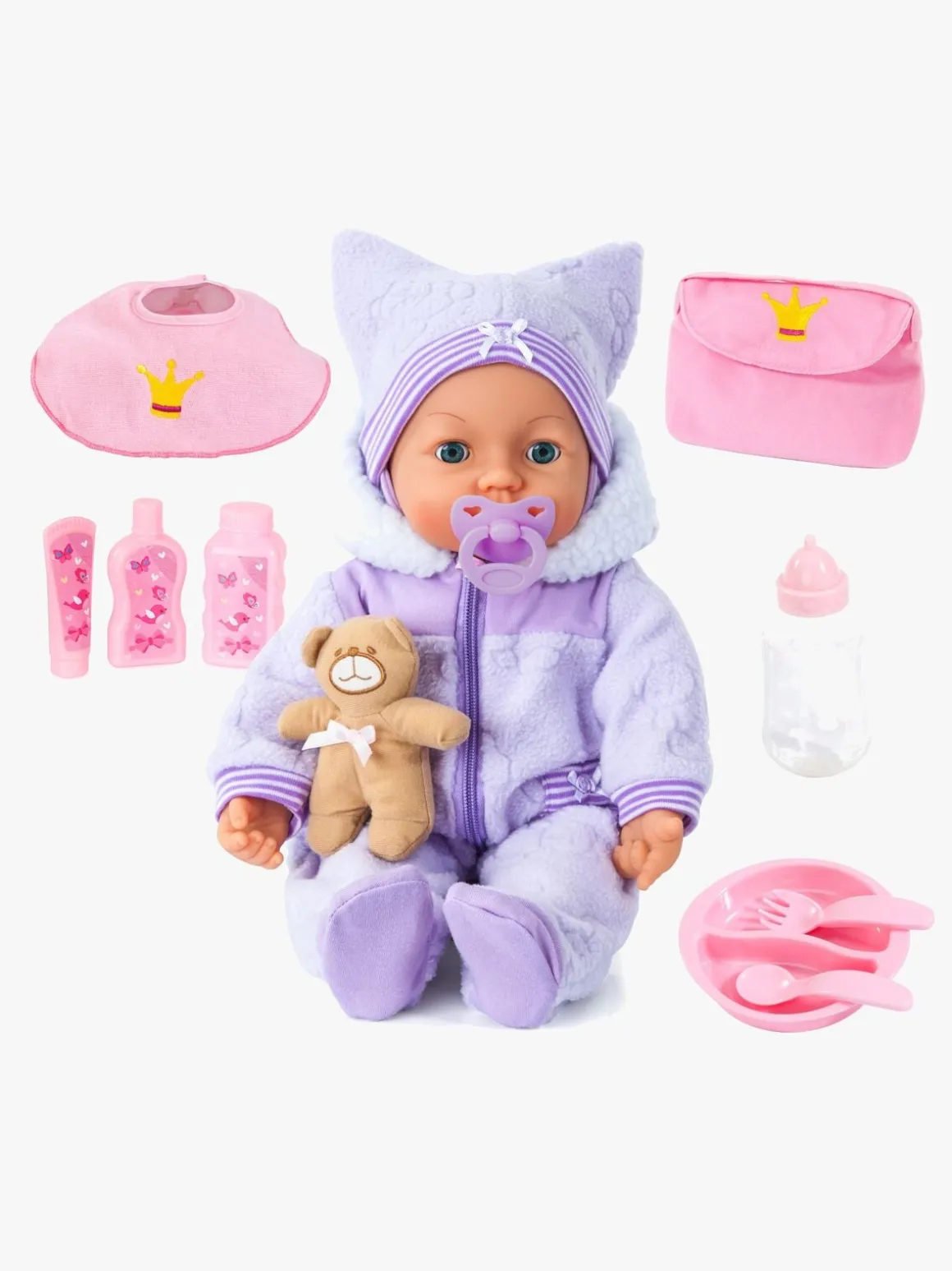 Med dukken får du et outfit, en pusletaske, en hagesmæk, en bamse, en tallerken og bestik af plastik, en sut, en sutteflaske og andet tilbehør.