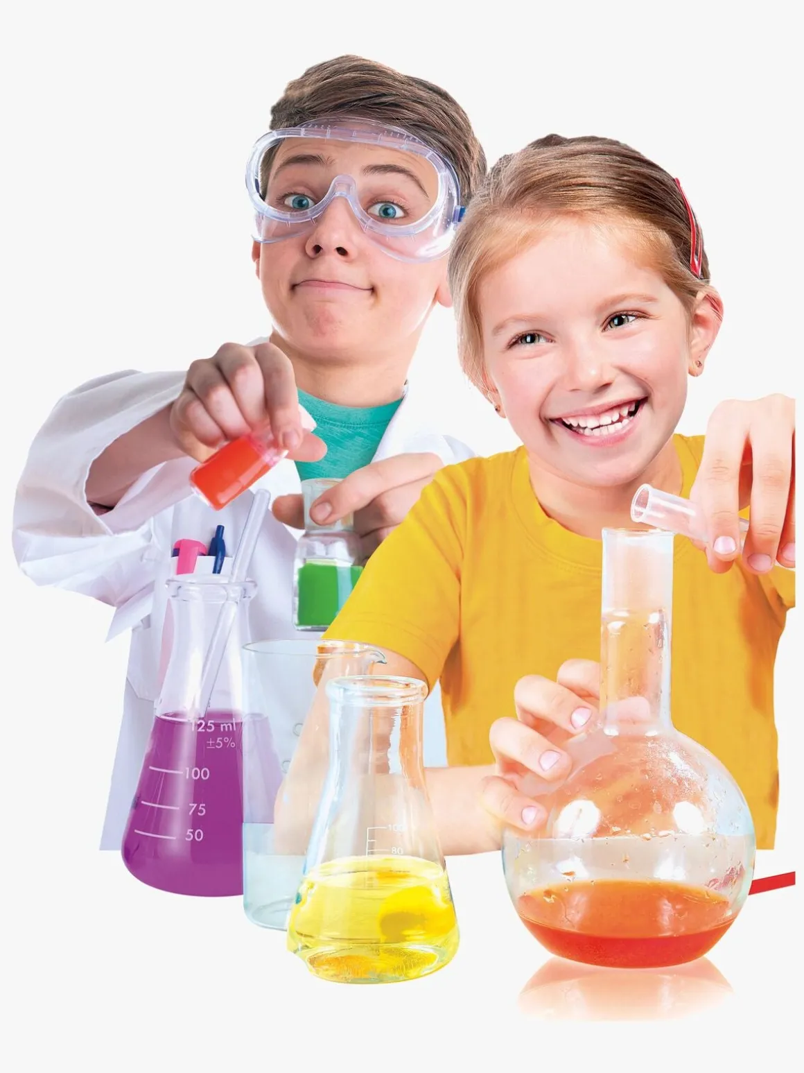 – Indeholder: beskyttelsesbriller, handsker, gennemsigtige rør, forskellige kemikalier, petriskål, reagensglas med låg, farverige klistermærker, tragt, forskellige redskaber, udfordringskort og andet passende tilbehør.