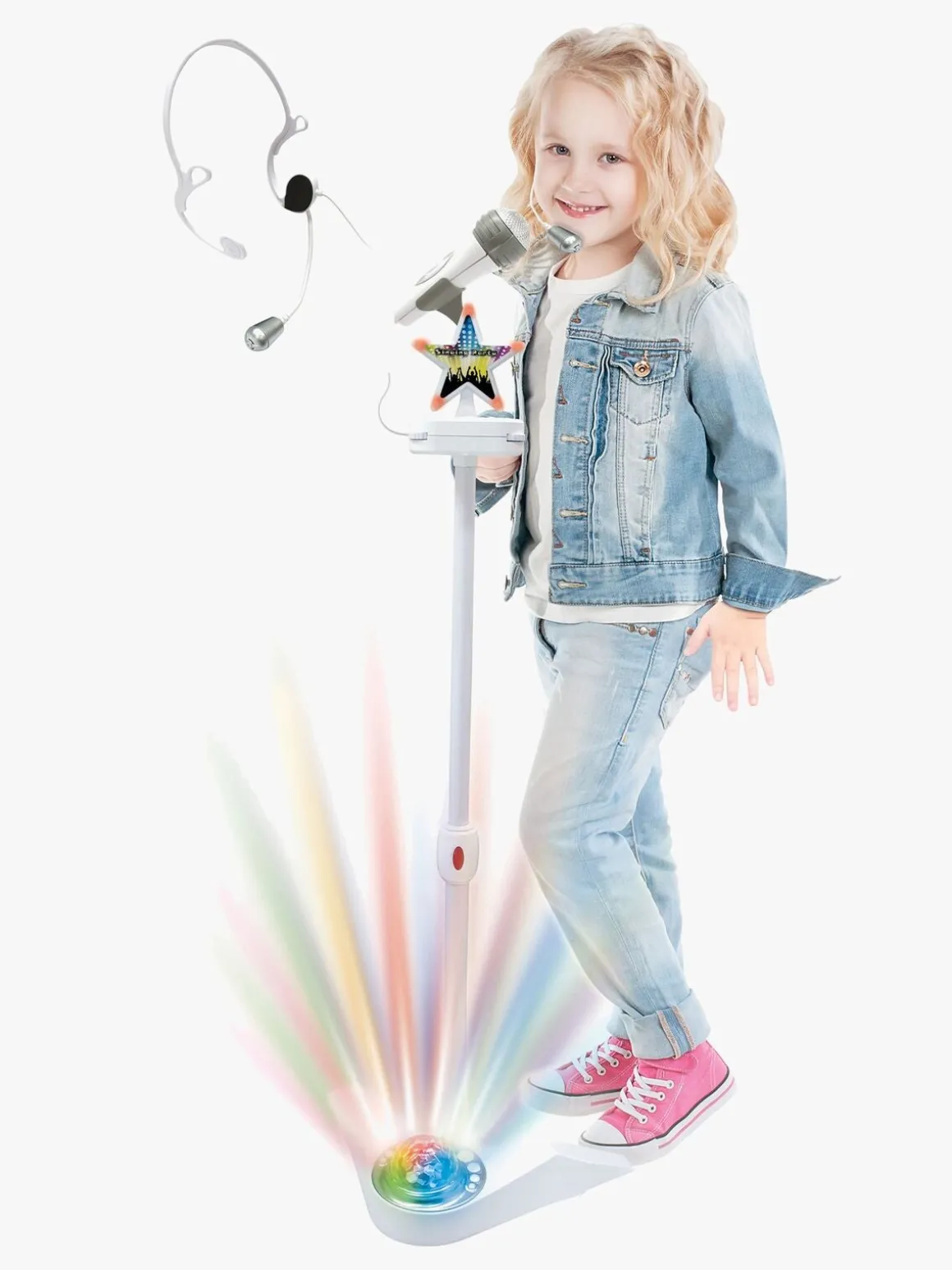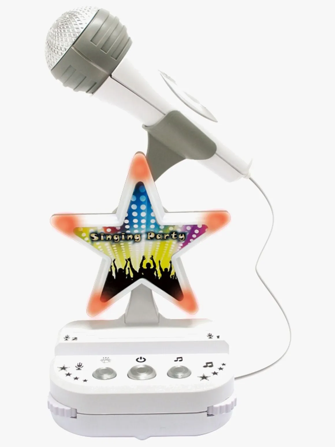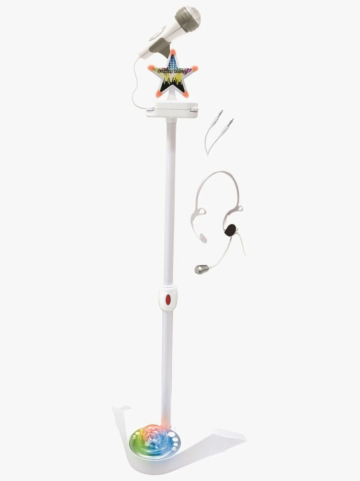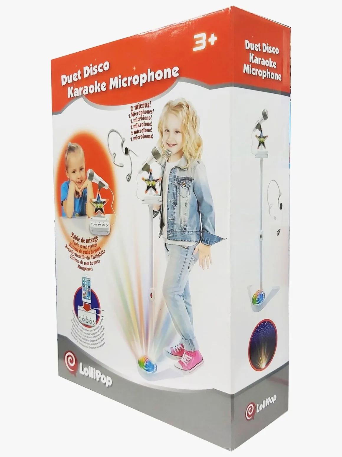 Lydsystemet kobles let til en smartphone og kan kobles til begge mikrofoner samtidigt, så du kan synge med din ven. Lydsystemet har en smartphoneholder, og mikrofonstativet kan justeres i højden.