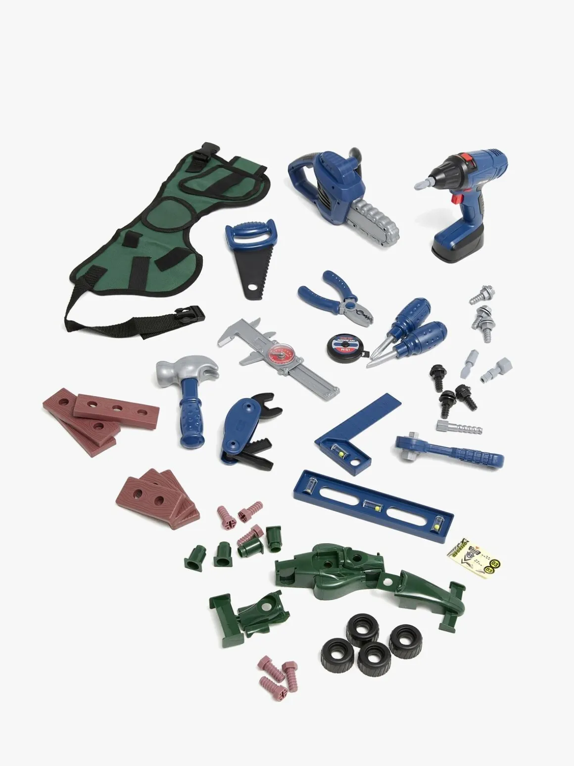 – Indeholder en stor værktøjskasse, værktøjsforklæde, elektrisk boremaskine, motorsav, hammer, skruer og meget andet tilbehør.
