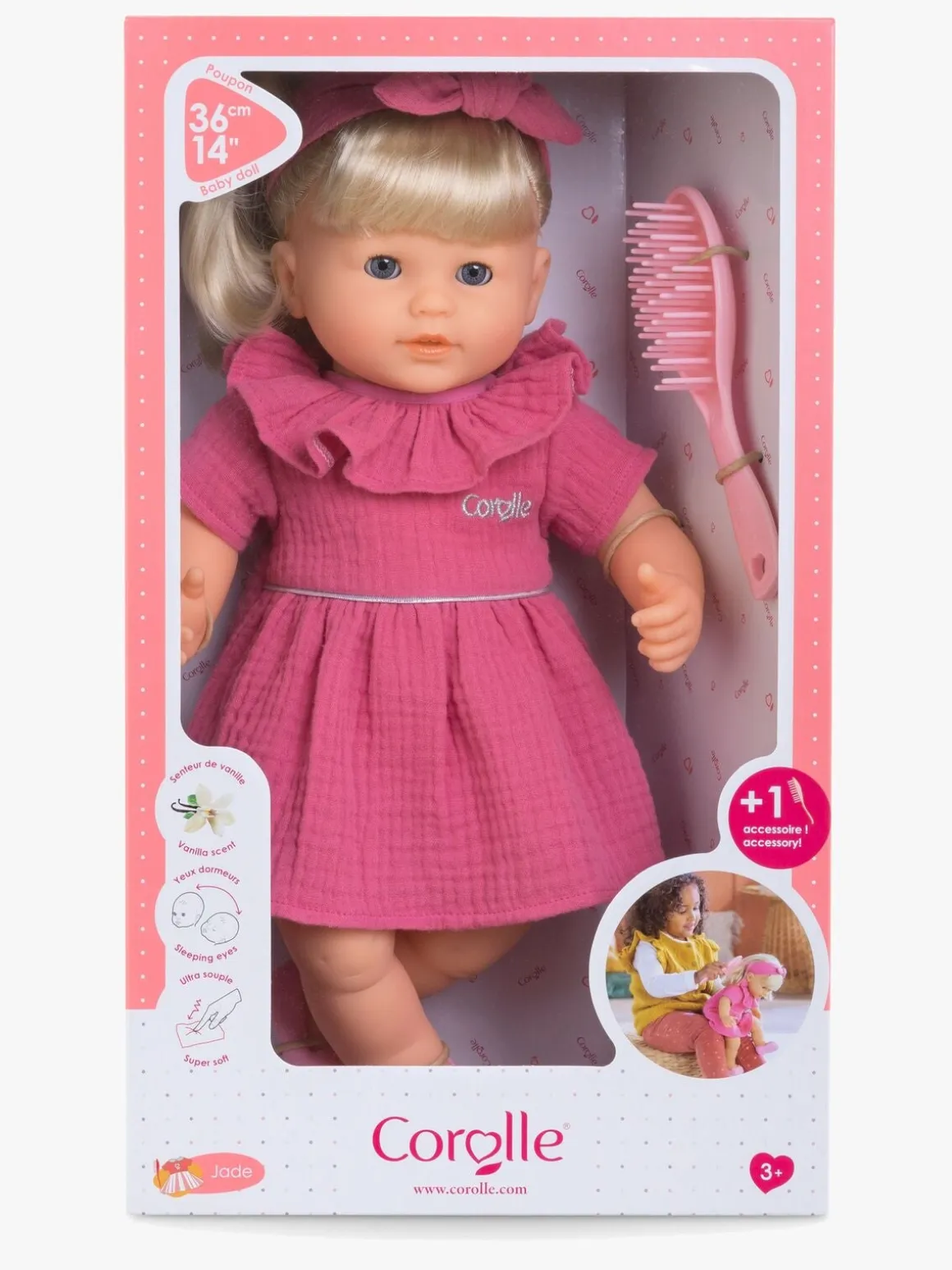 – Dukken er klædt i en lyserød kjole, med pandebånd og matchende ballerinasko.