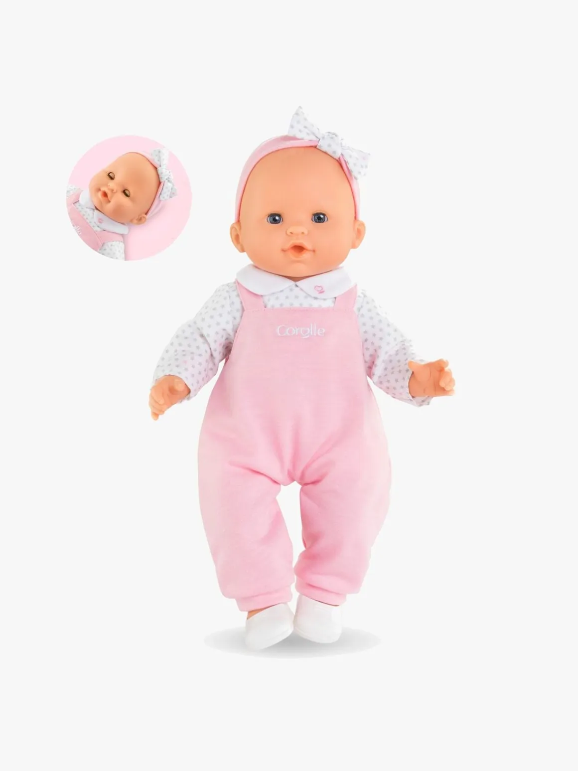 – Dukken er klædt i en sød jumpsuit, med matchende pandebånd og aftagelige hvide sko.