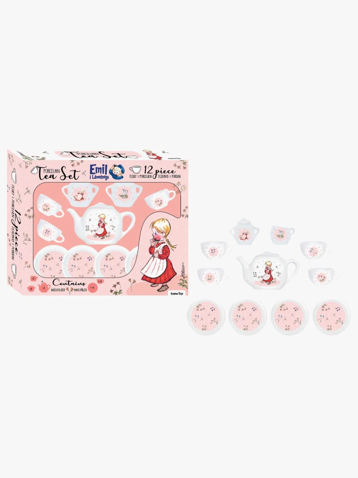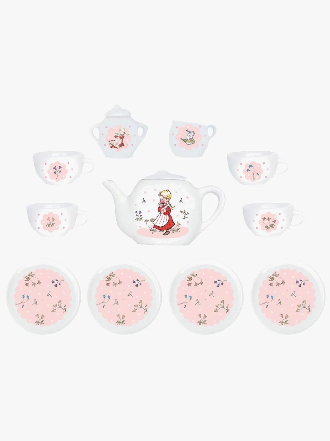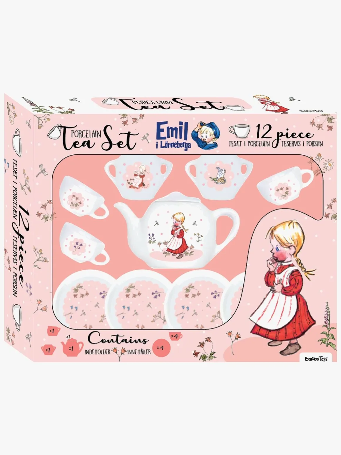 – Indeholder: 1 tepotte med låg, 4 rum, 4 underkopper, 1 sukkerskål med låg, 1 mælkekande.