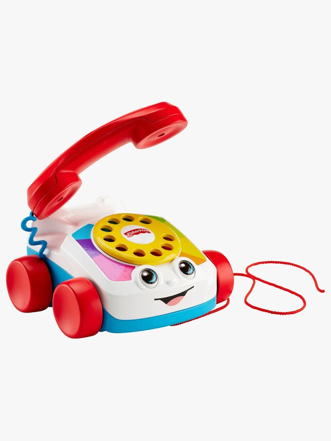 En sjov legetøjstelefon med lydfunktioner fra Fisher-Price. Denne søde telefon har et klassisk telefonrør, en drejeskive, fire hjul og en snor til at trække den i. Dit barn kan trække telefonen efter sig, og lade som om at det ringer til sine venner.