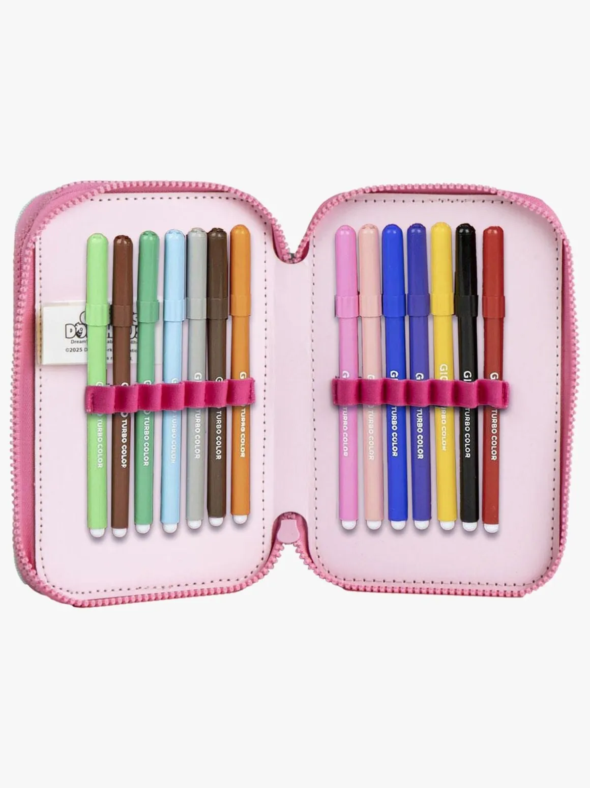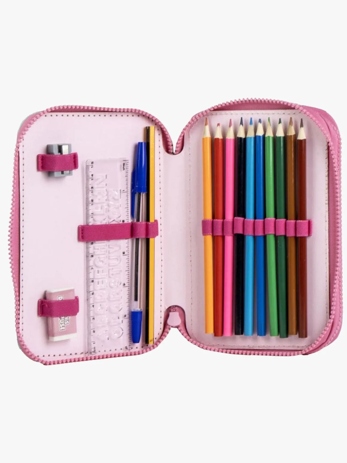 – Indeholder: 1 penalhus, 10 farveblyanter, 14 filttusser, 1 viskelæder, 1 blyantspidser, 1 kuglepen, 1 blyant, 1 lineal.