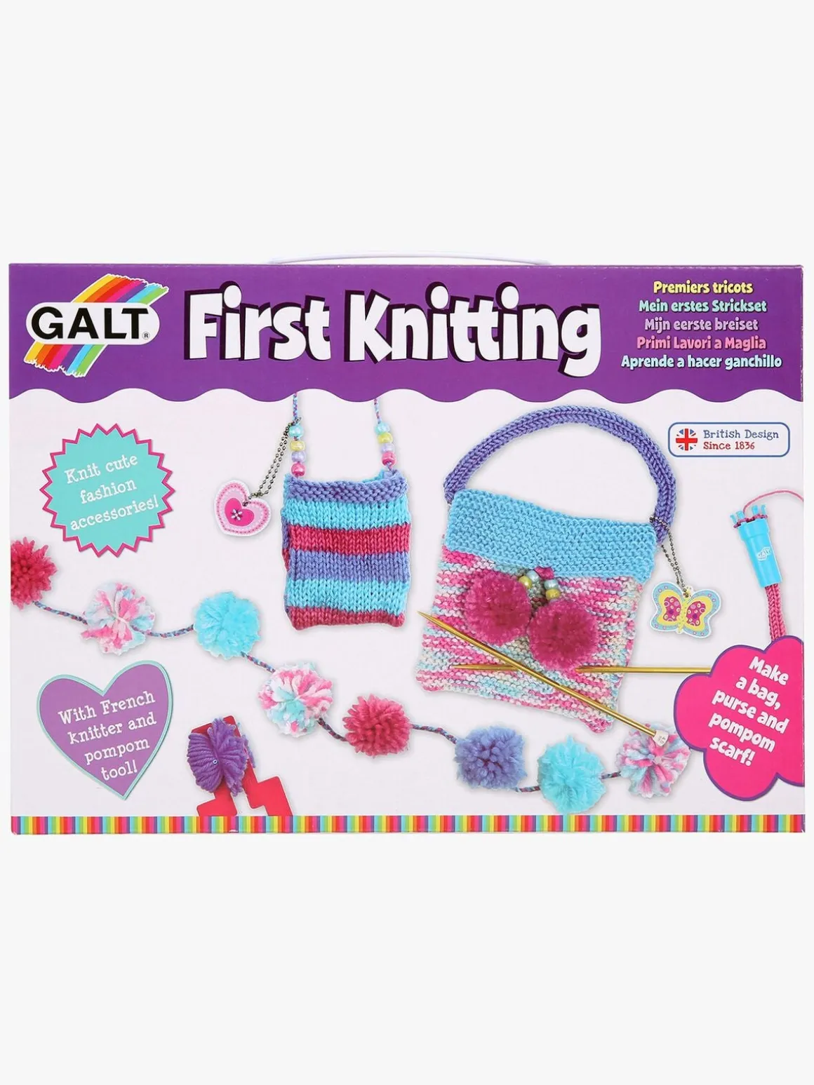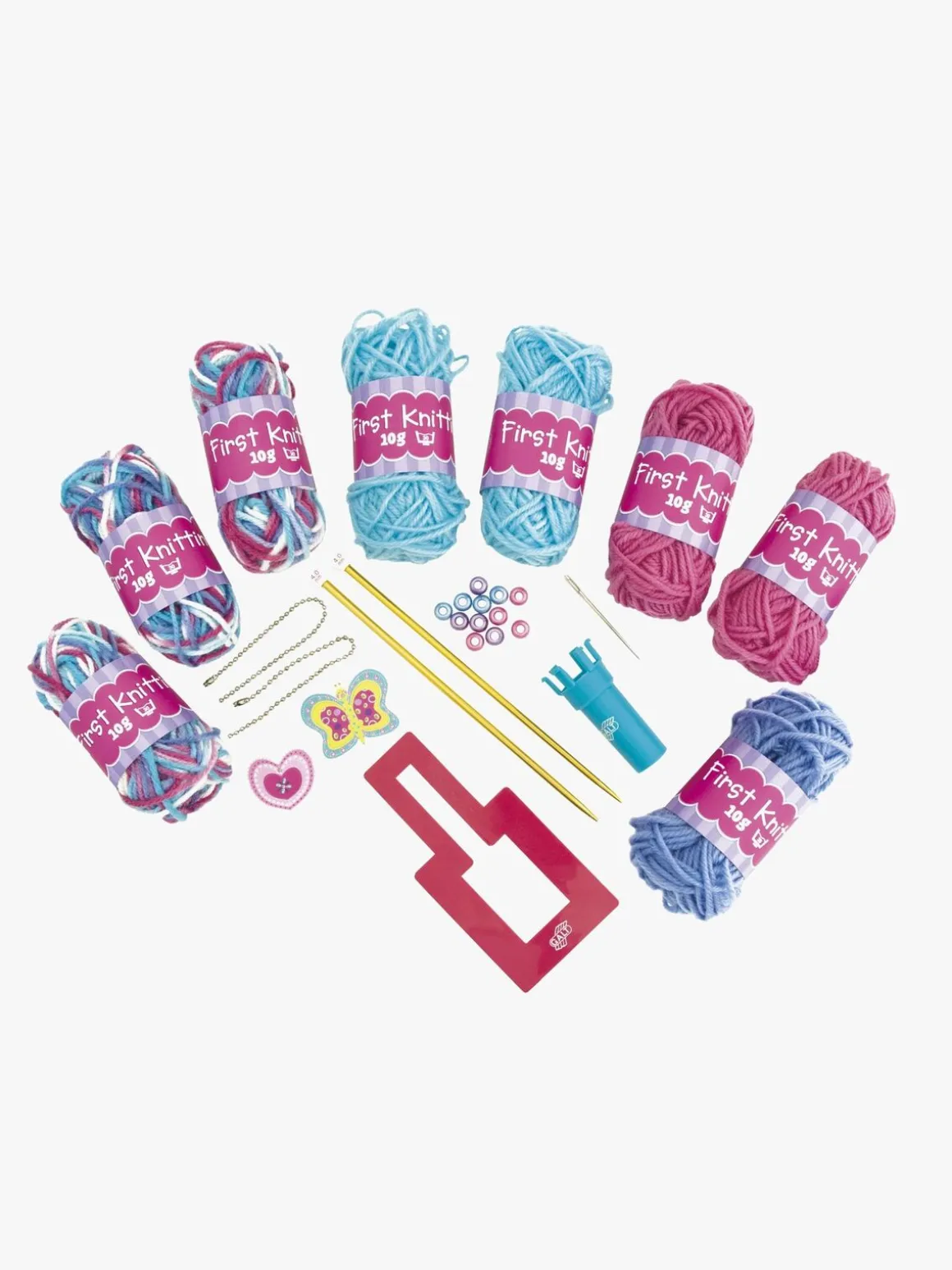 Indeholder blandt andet 8 garnnøgler, et sæt strikkepinde, en strikkelise og et pompon-værktøj.