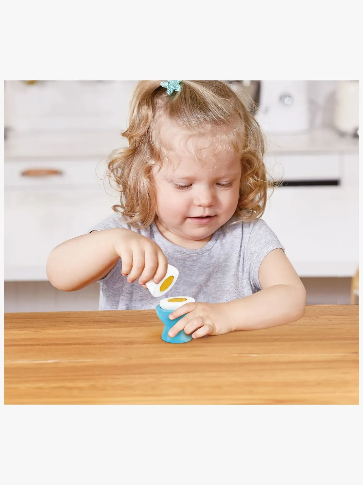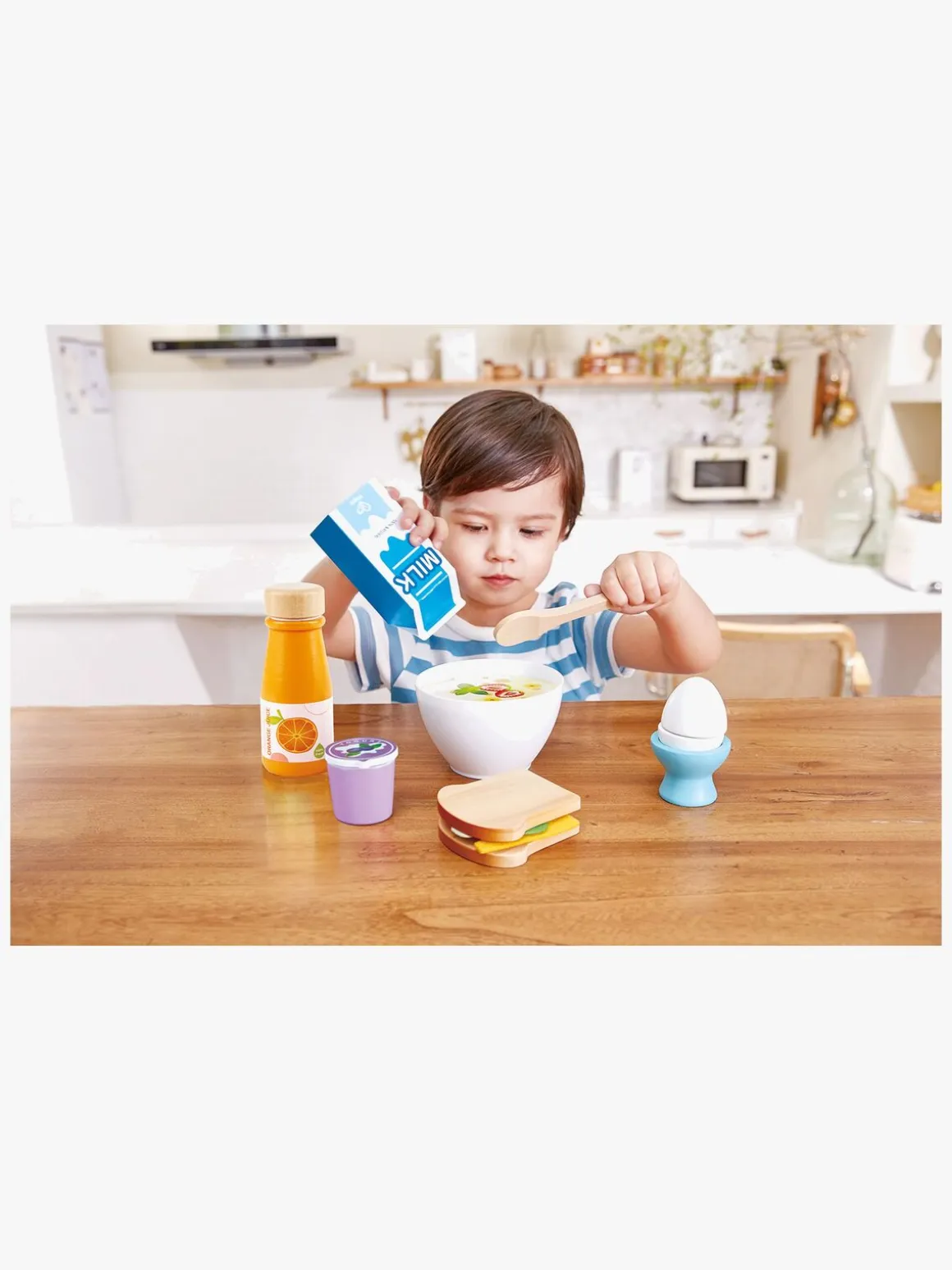 – Indeholder: 1 mælkekarton, 1 juiceflaske, 1 yoghurt, 1 æg, 2 brødskiver, 1 tomatskive, 1 salatblad, 1 osteskive, 1 skål, 1 ske.