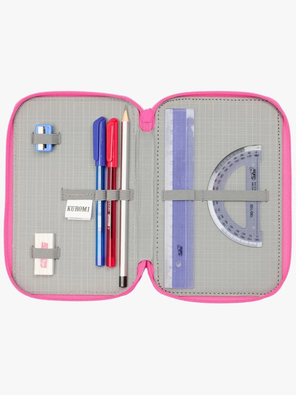 – Indeholder: 1 penalhus, 1 viskelæder, 1 blyant, 2 kuglepenne, 1 blyantspidser, 2 linealer, 16 farveblyanter, 14 tusser.