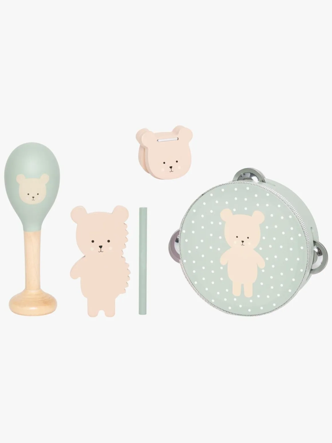 – Indeholder: 1 guiro, 1 tamburin, 1 maraca, 1 kastagnetter.