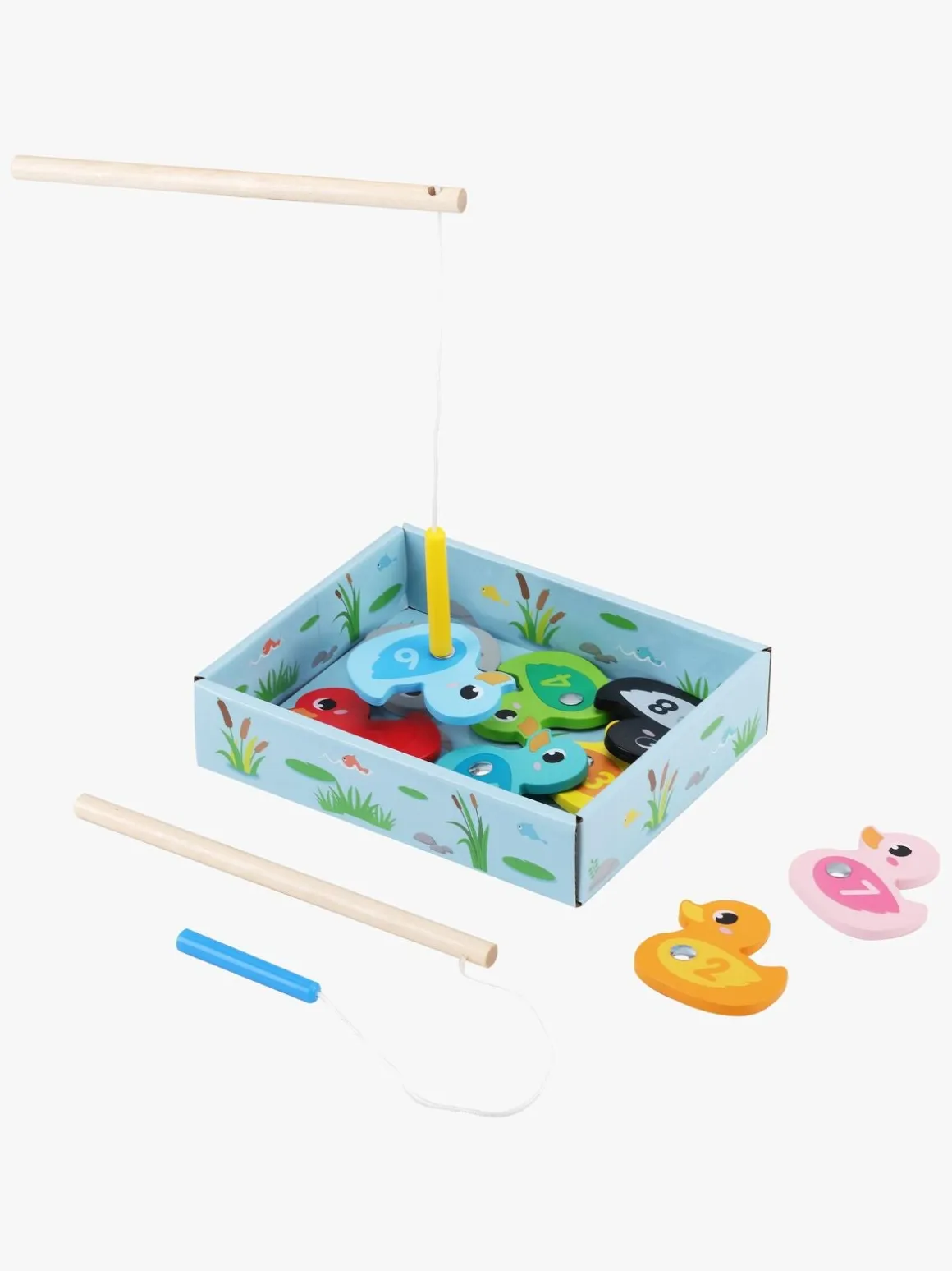 – Kommer med ænder, der alle er udstyret med en magnet, og to fiskestænger med magnetkroge.