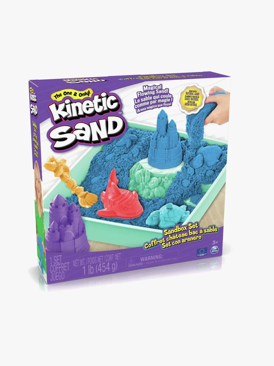 – Indeholder 454 g kinetisk sand, 3 sandfigurer (skildpadde, haj og slot), 1 skovl, 1 sandkasse.