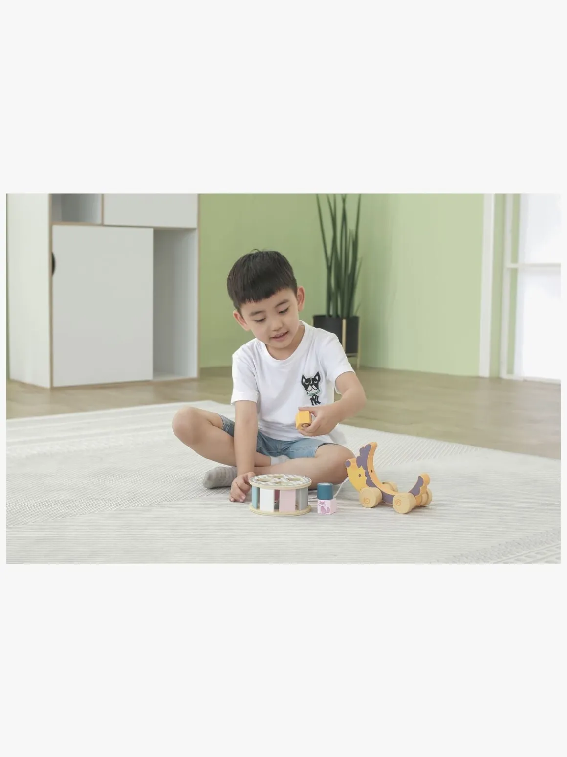 – Indeholder: 1 træklegetøj, 1 puttekasse, 4 klodser.