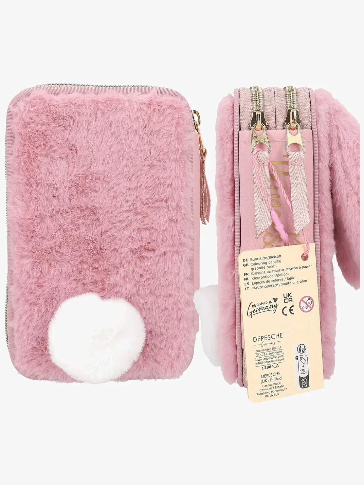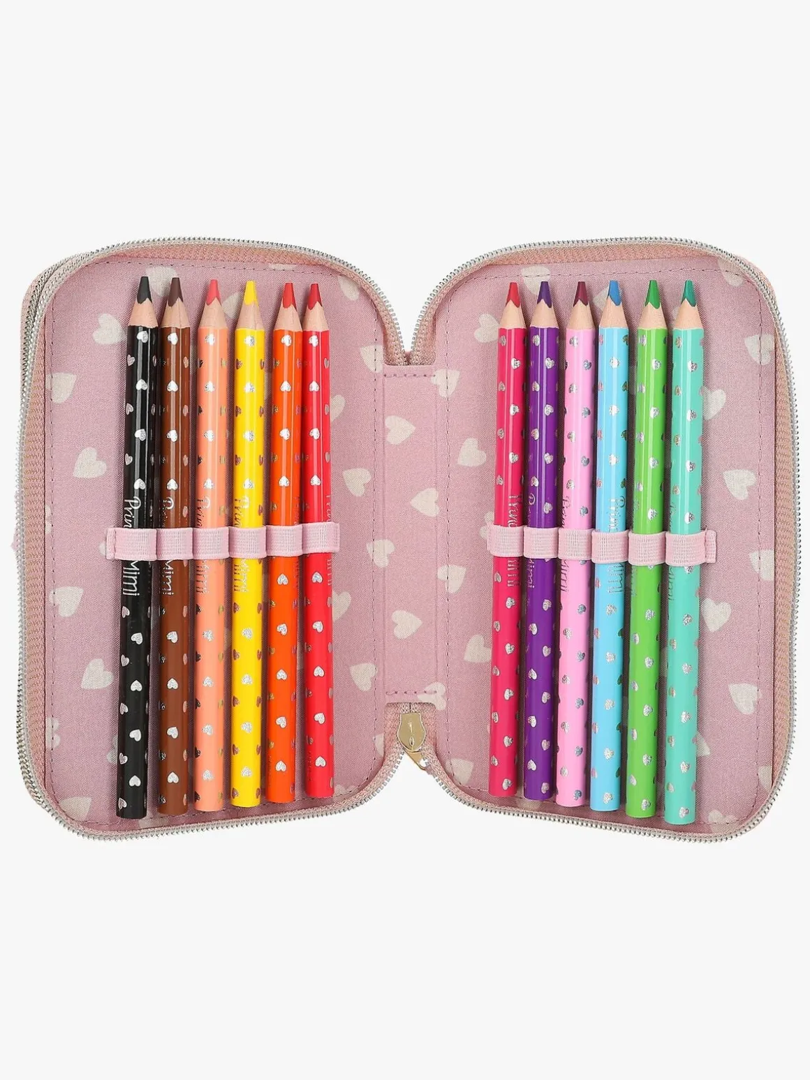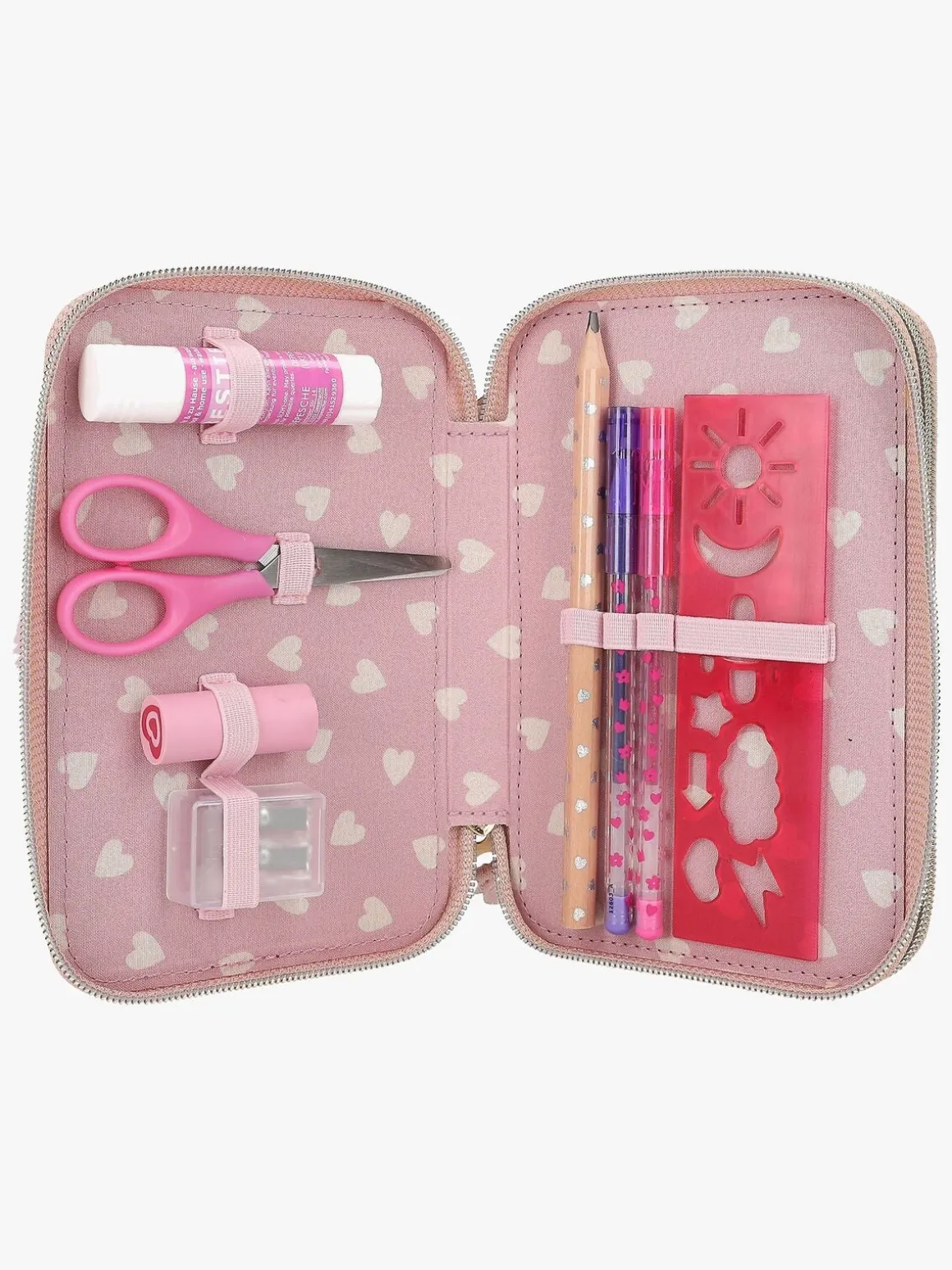 – Indeholder: 1 penalhus, 12 farveblyanter, 2 glittertusser, 1 blyant, 1 saks, 1 limstift, 1 blyantspidser, 1 lineal, 1 viskelæder.
