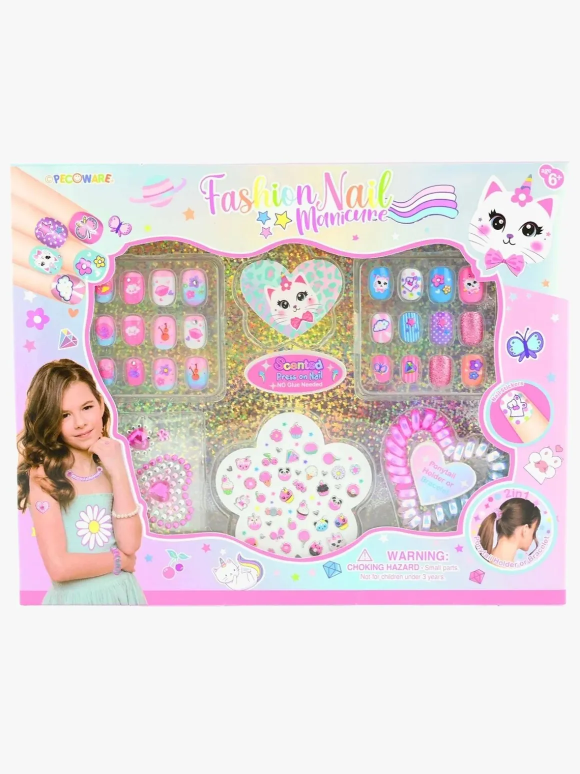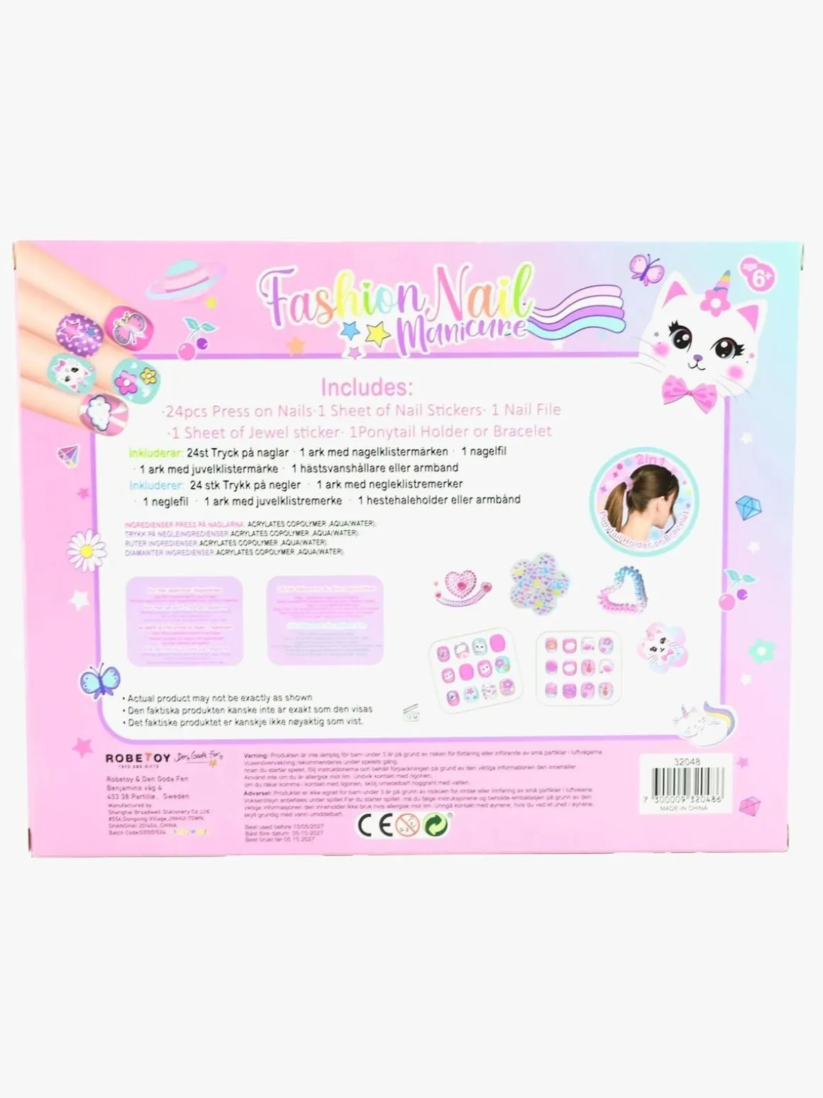 – Indeholder: 24 kunstige negle, 1 ark med negleklistermærker, 1 neglefil, 1 ark med juvelklistermærker og 1 armbånd.