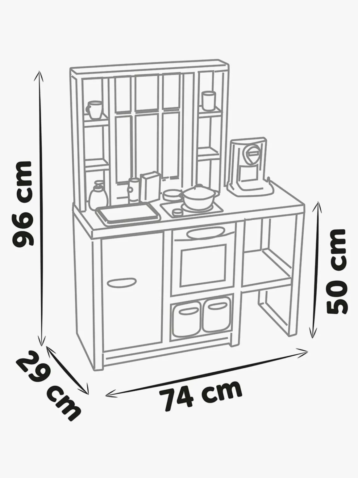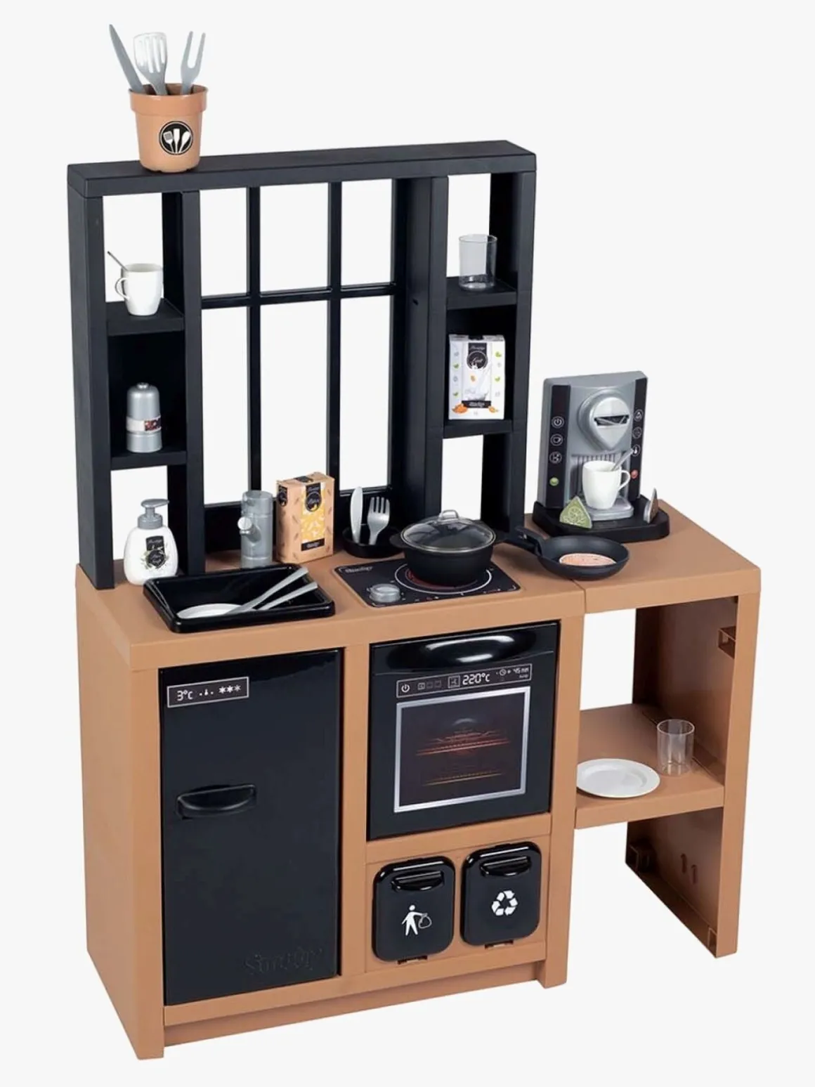 – Indeholder: 1 legekøkken, 1 opbevaringshylde, 1 kaffemaskine, 5 køkkenredskaber, 2 gafler, 2 knive, 2 skeer, 2 tallerkener, 2 glas, 2 kopper, 1 stegepande, 1 salt- og pebersæt, 1 gryde, 3 madvarer.