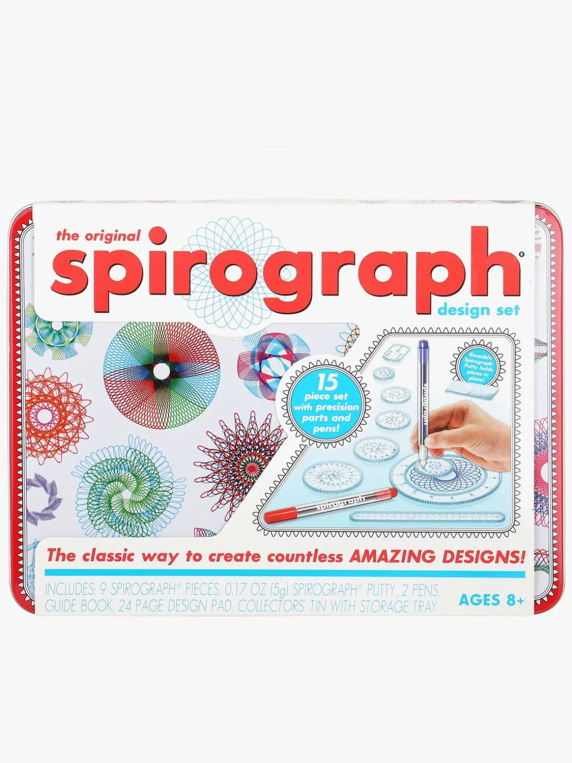 Den robuste metalæske indeholder: 6 runde skiver, 1 ring, 1 formskive, 1 stang med takker, 2 tusser, Spirograph hæftemasse, tegnebog m. 24 sider og illustrerede instruktioner.