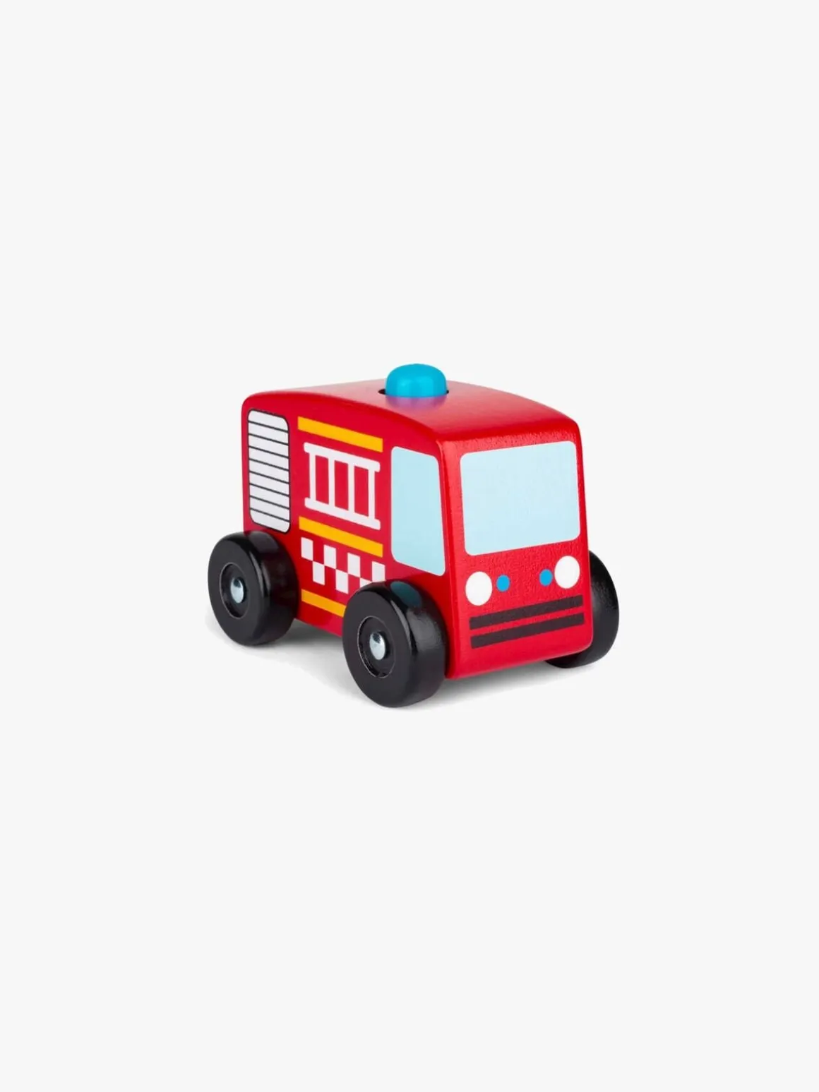 Bilen er fremstillet af træ og har bevægelige træhjul, der gør, at den kan køre rundt og tages med på eventyr. Bilen giver lyd fra sig, når man trykker på knappen, der sidder på toppen af brandbilen.