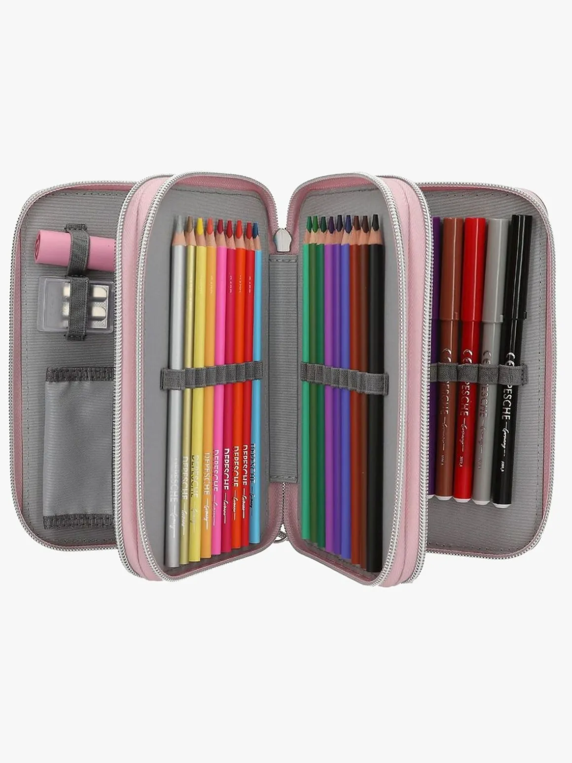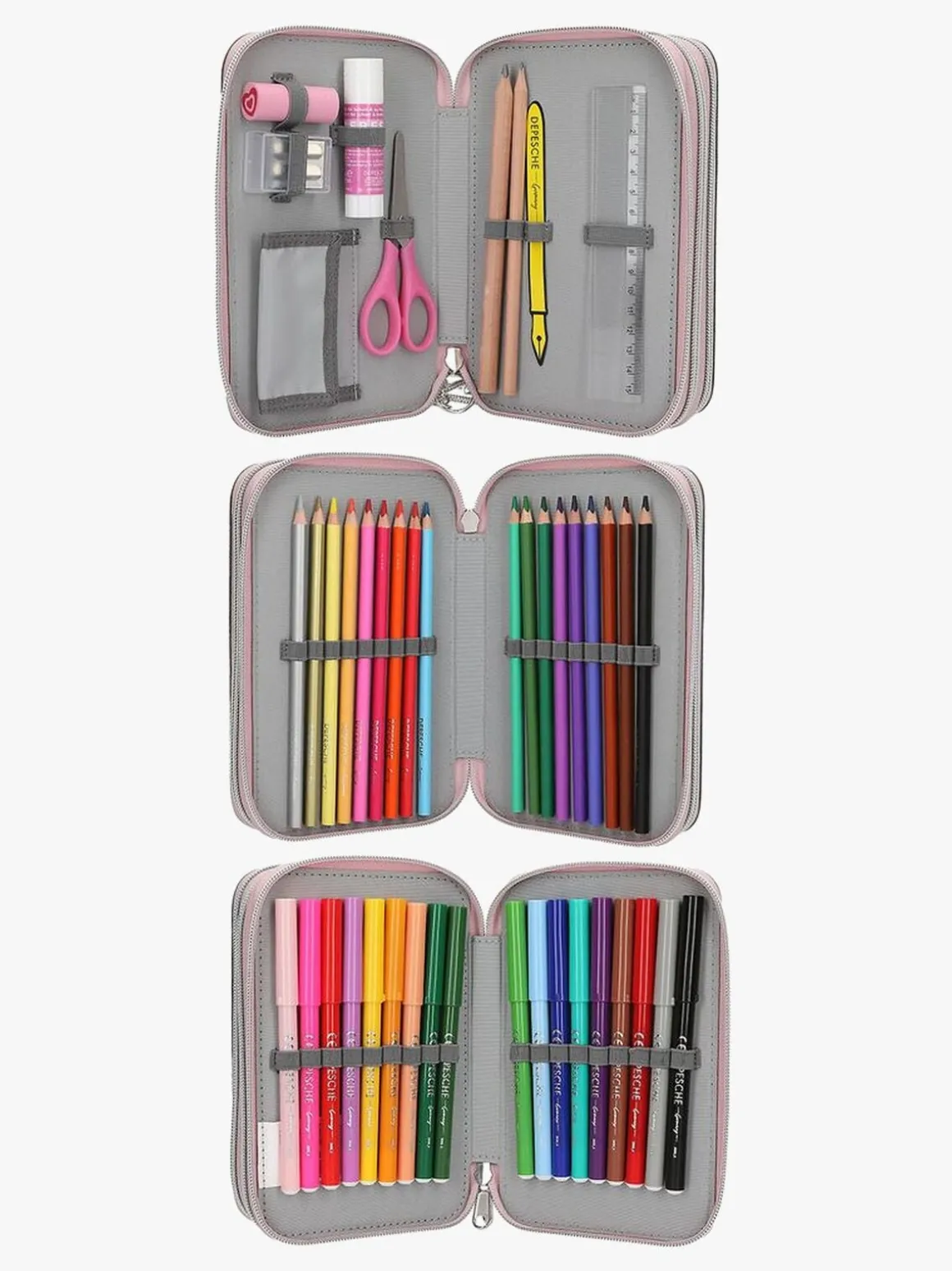 – Indeholder: 1 penalhus, 18 farveblyanter, 18 tusser, 2 blyanter, 1 saks, 1 limstift, 1 blyantspidser, 1 lineal, 1 viskelæder.