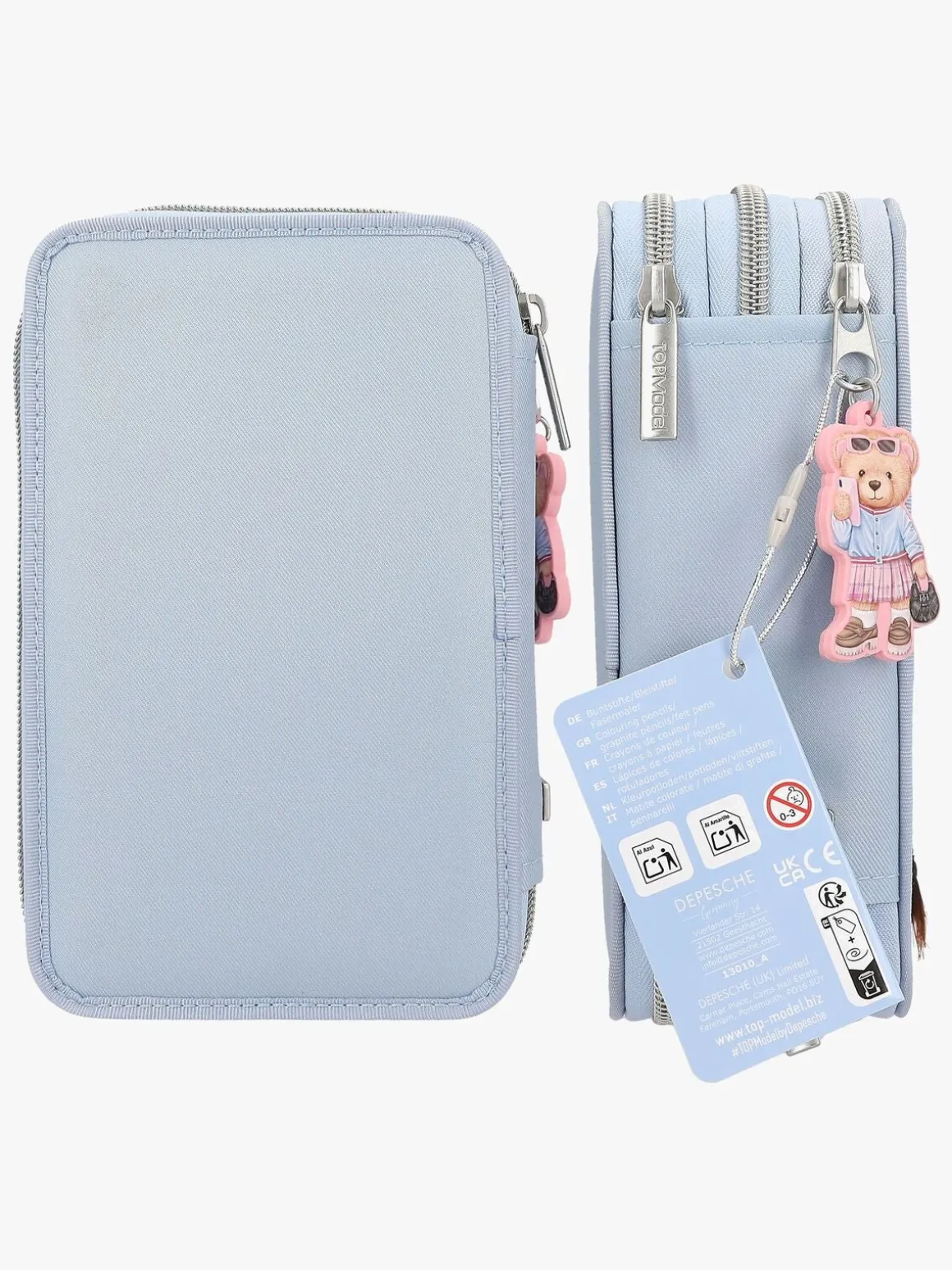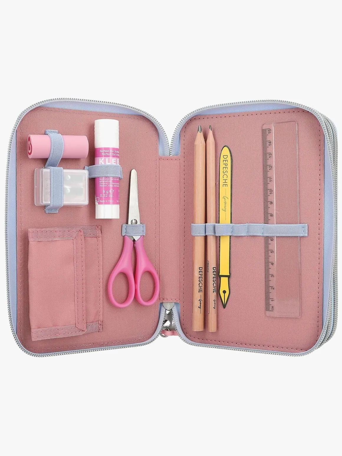 – Indeholder: 1 penalhus, 18 farveblyanter, 18 tusser, 2 blyanter, 1 saks, 1 limstift, 1 blyantspidser, 1 lineal, 1 viskelæder.