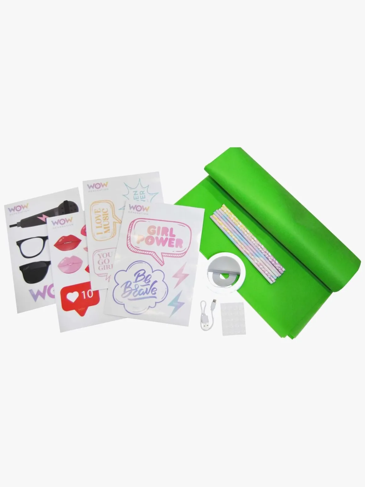 – Indeholder: en clip-on selfielampe, et usb-kabel, fire tilbehørsark, 8 papirsugerrør, et grønt tapet og en brugsvejledning.